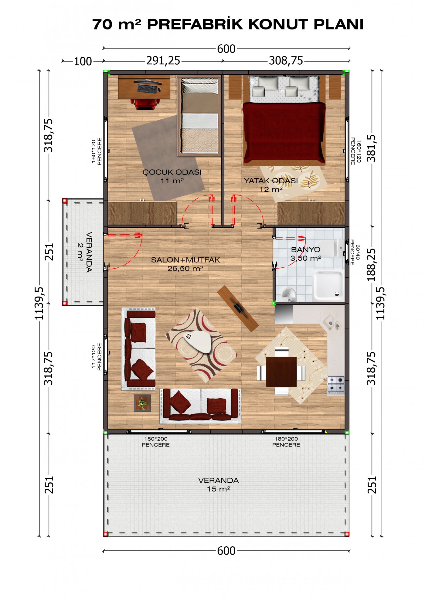 • Pencereler: 120*100 cm PVC ısıcamlı