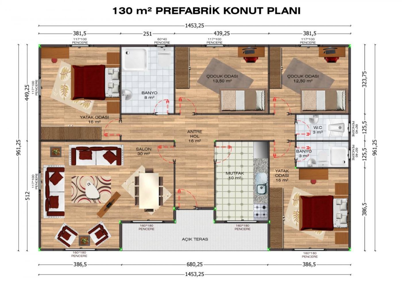 - Pencereler: 120*100 cm PVC ısıcamlı