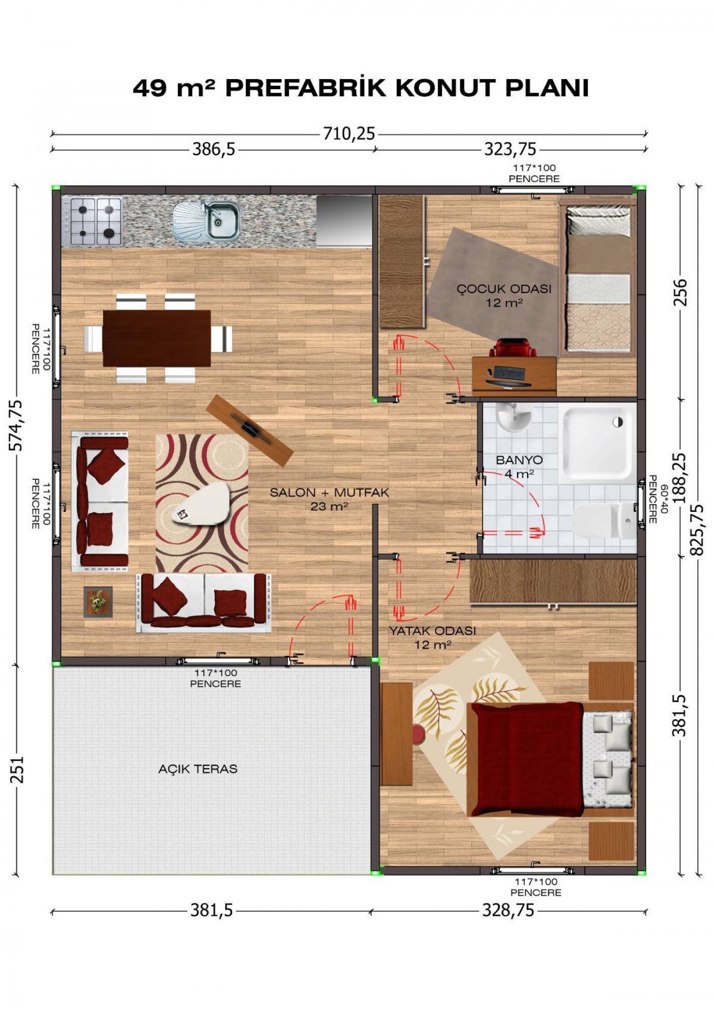 - Pencereler: 120*100 cm PVC ısıcamlı