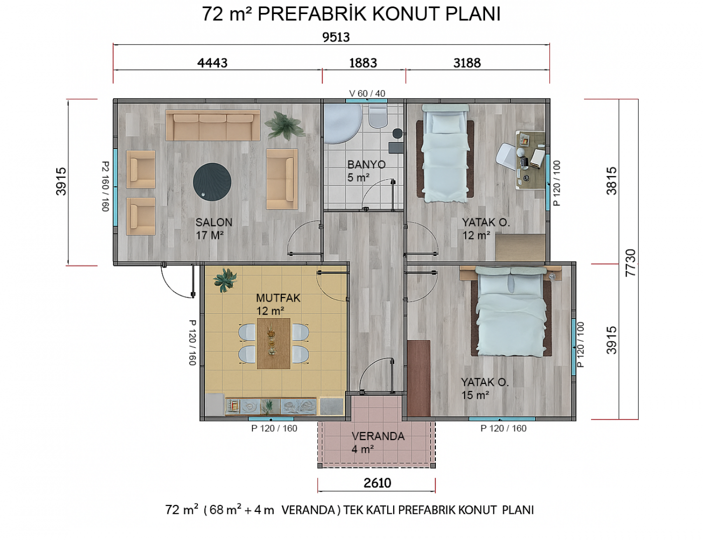 72 m2 Tek Katlı Prefabrik Ev Modelleri