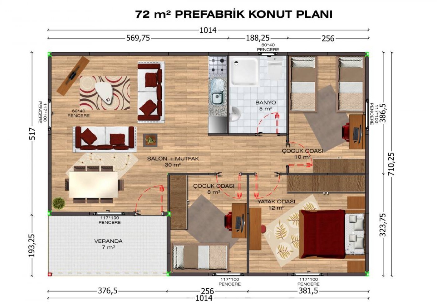 - Pencereler: 120*100 cm PVC ısıcamlı