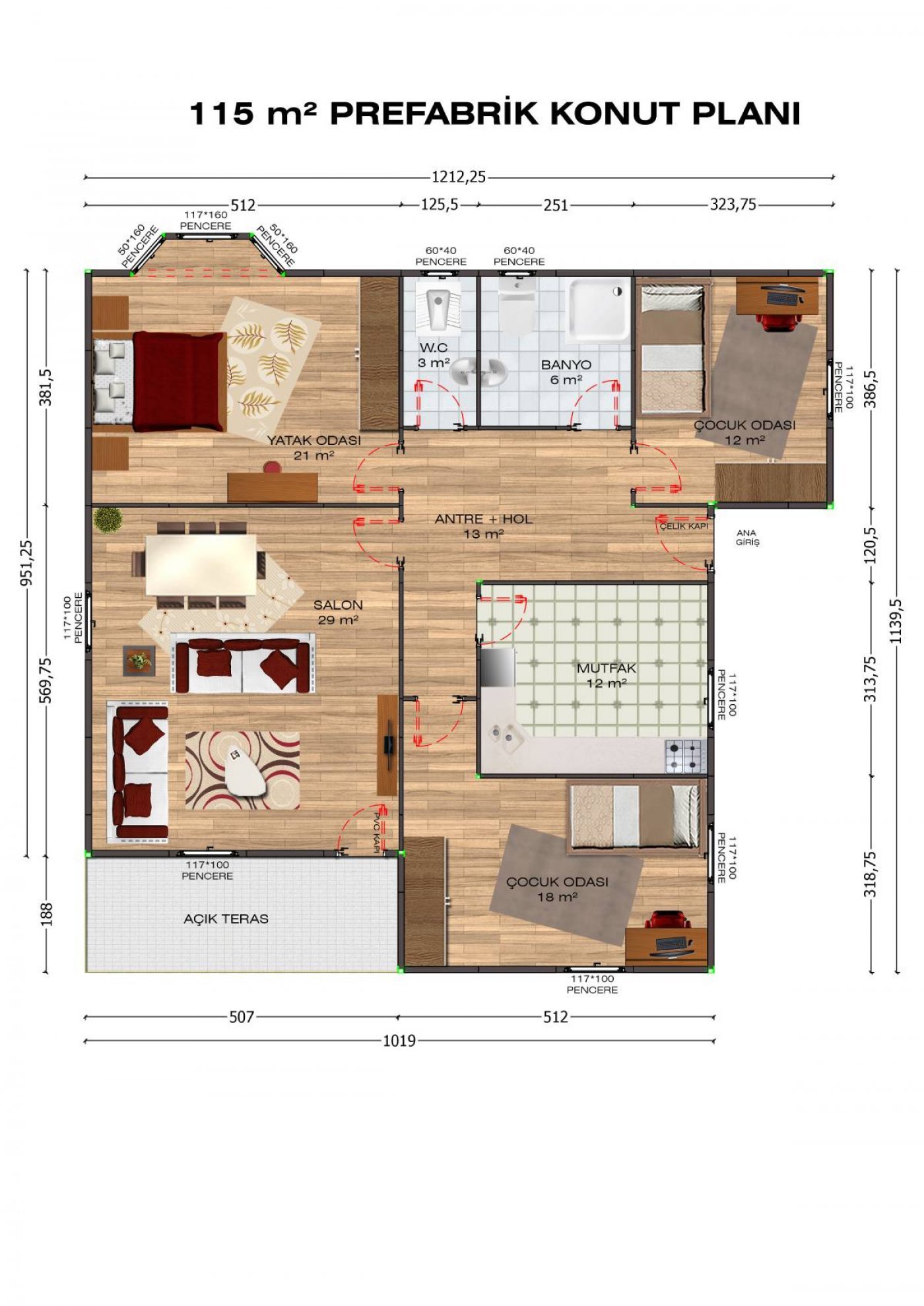 - Pencereler: 120*100 cm PVC ısıcamlı